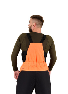 Утепленные женские брюки анатомического кроя на эластичных регулируемых лямках. Спинка и лямки съемные. Брюки застегиваются на молнию и пуговицу. Объем талии регулируется по бокам патами на липучках.