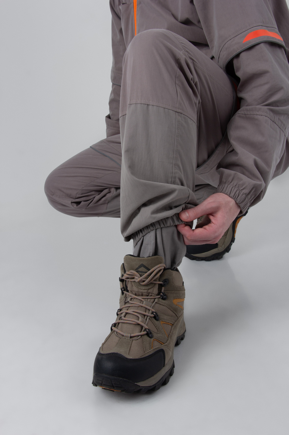 Брюки также отличаются продуманным дизайном. Эластичный пояс с шлевками и внутренней утяжкой на шнурке гарантирует идеальную посадку. Колени брюк усилены для дополнительной прочности. Низ брюк собран на резинку, что обеспечивает дополнительный комфорт во время движения. Два боковых кармана без застежки дополняют функциональность модели. Внутренние манжеты на штрипках позволяют заправлять брюки в ботинки для максимальной защиты.