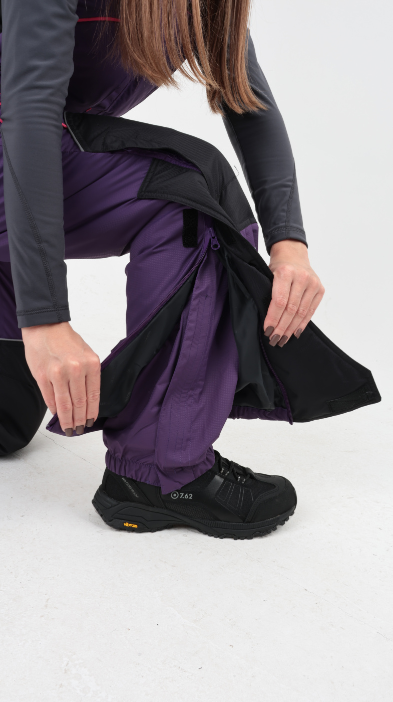 Брюки костюма имеют регулируемые лямки, позволяющие удобно зафиксировать их на плечах и адаптировать под индивидуальные предпочтения пользователя. Низ брюков утягивается резинками, что предотвращает задирание и обеспечивает надежную защиту от холода, снега и воды.